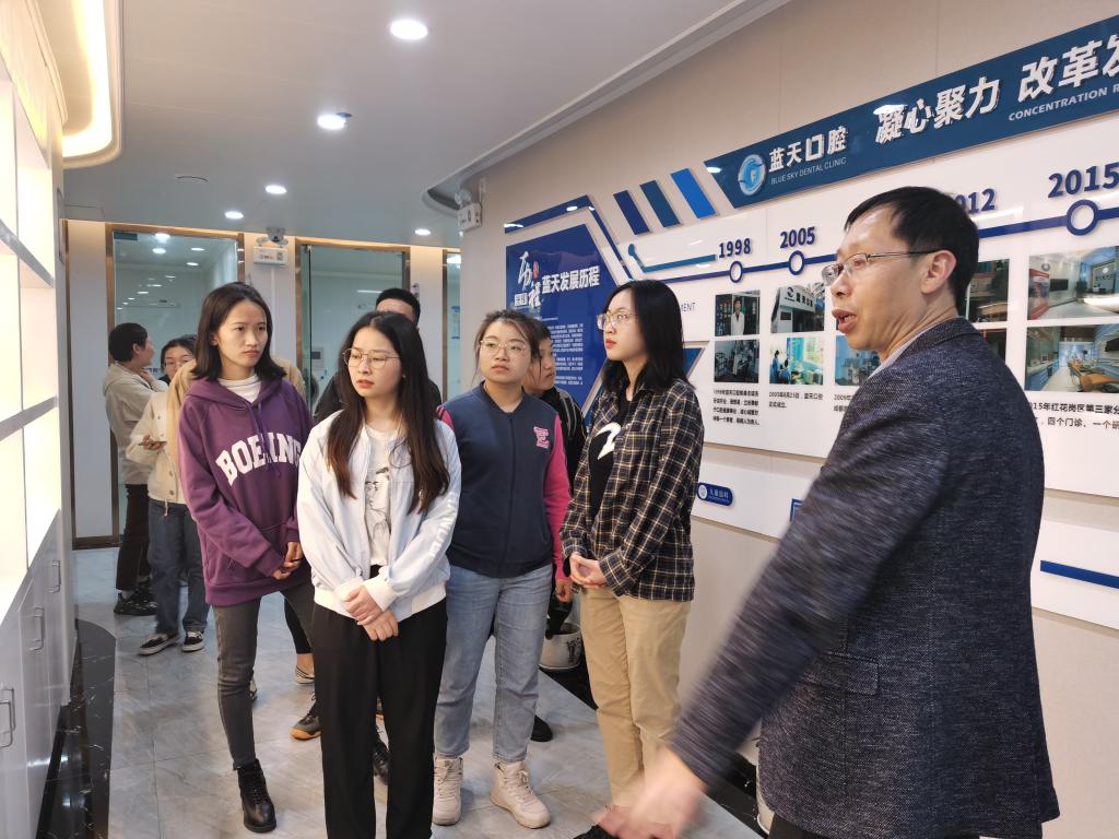 蓝天口腔医院蔡院长带领同学们参观蓝天口腔医院的几个院区,逐一介绍了医院的软、硬件设施。参观完后,蔡院长给同学们分享了建院理念、医院现状、未来发展规划等,表示医院目前除重视临床工作外,还怀着高度的社会责任感,努力做好口腔健康科普、公益活动回报社会,树立良好的民营医院新形象,并根据市场的需要,做到科有特色,人有专长。与同学们深入交流有关就业问题后,蔡院长表示非常欢迎同学们毕业后加入蓝天口腔。