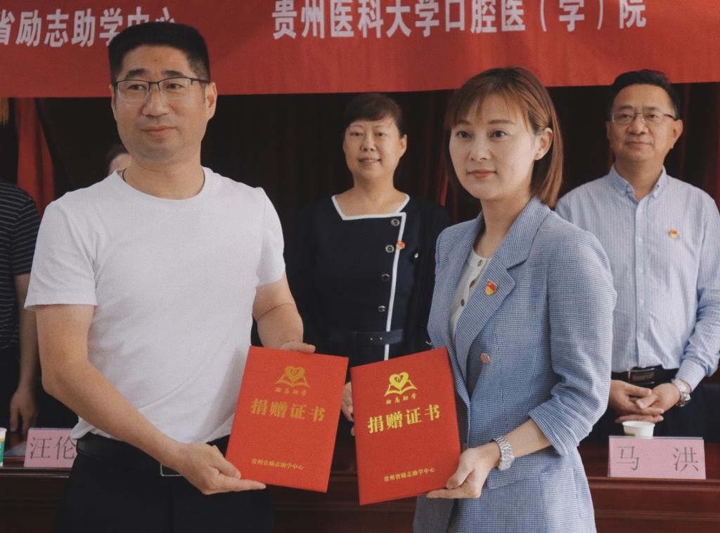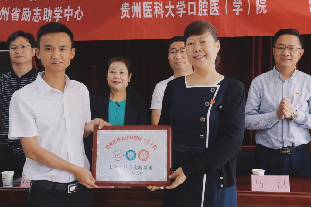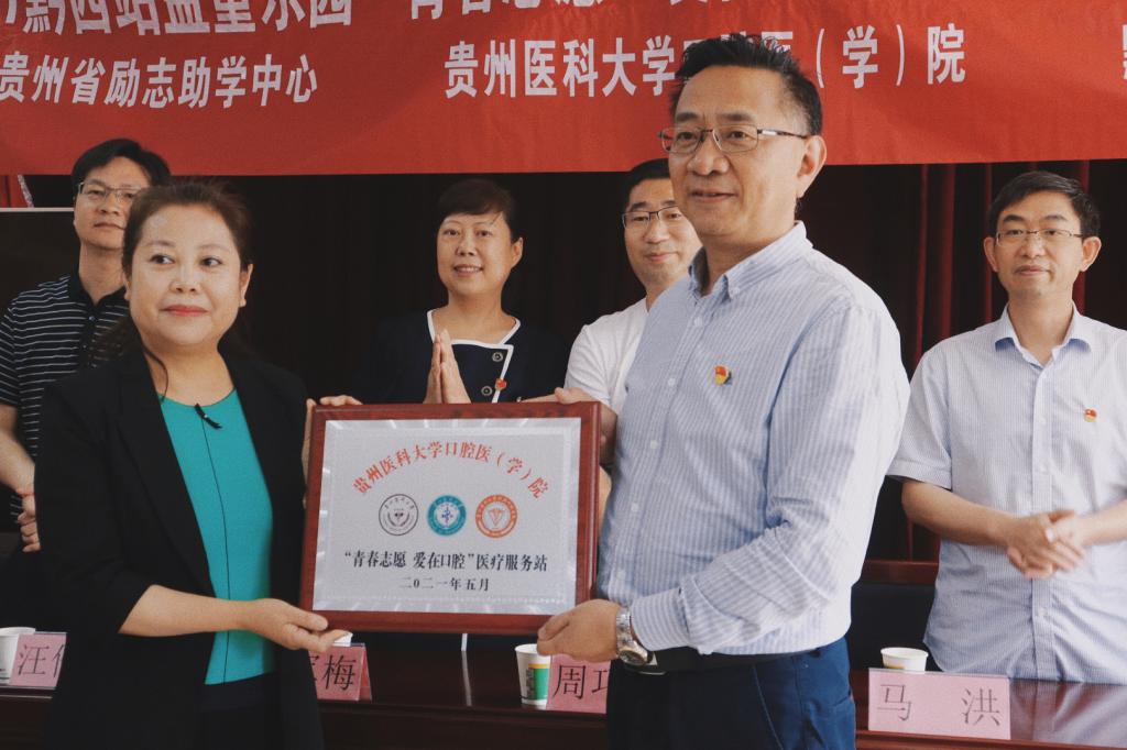 马洪为黔西站益童乐园授“beat365唯一官方网站口腔医(学)院‘青春志愿 爱在口腔’医疗服务站”牌,张军梅为黔西站益童乐园授“beat365唯一官方网站口腔医(学)院大学生社会实践基地”牌,周巧明为口腔医(学)院颁发爱心共建单位证书。