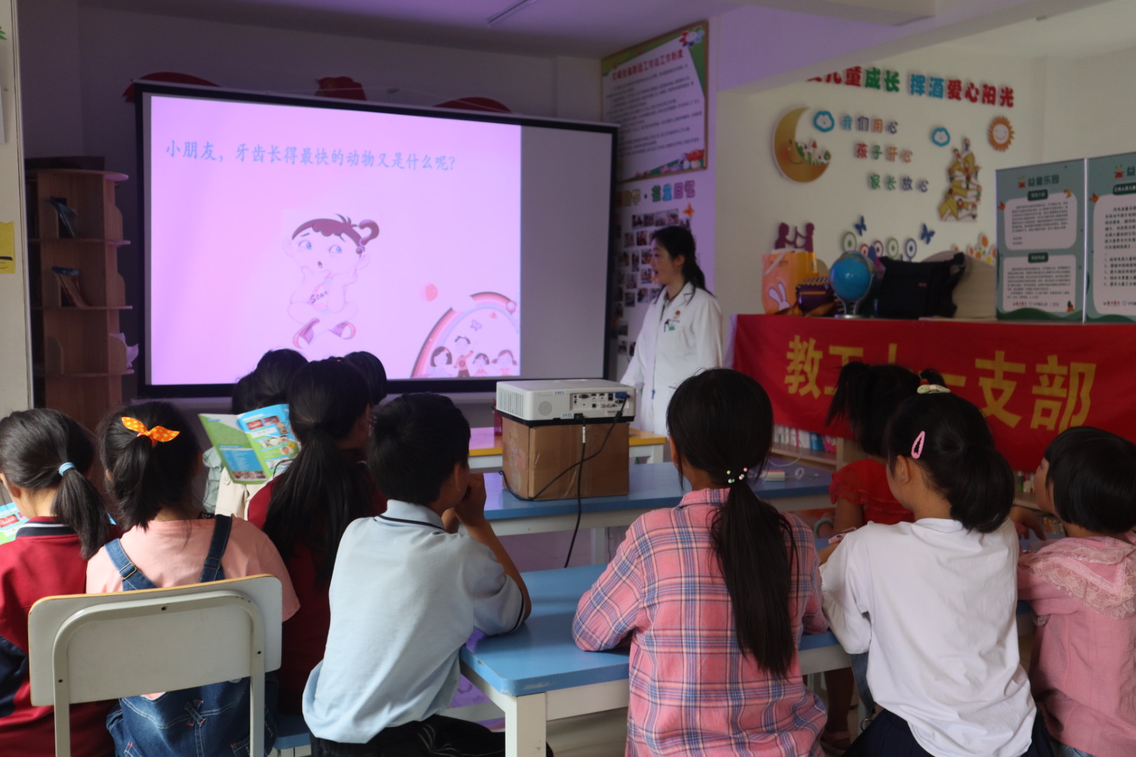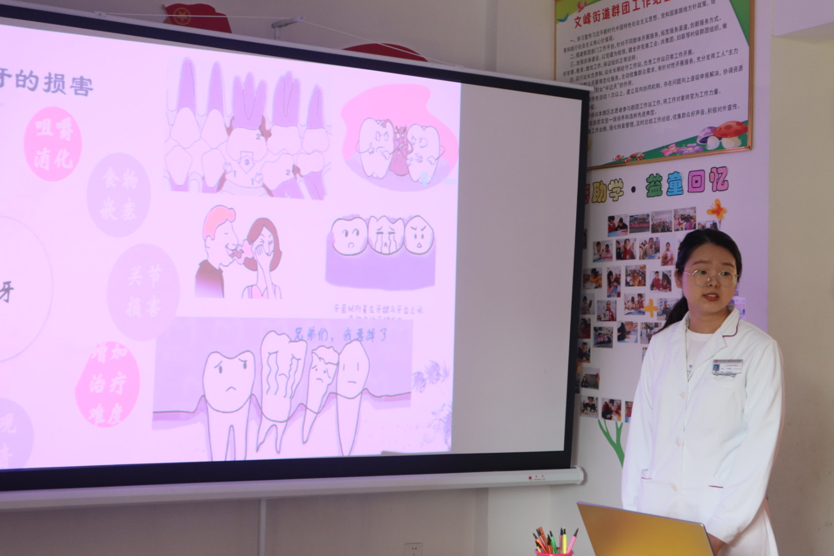 口腔医(学)院医护人员针对塔山社区易地搬迁点青壮年大多外出务工,留守家里多为老人和小孩,需更多关怀的特点,精心准备科普讲座和义诊,由魏宏琳医生和刘春影医生分别作题为“口腔卫生保健知识讲座”及“口腔修复小讲座”的科普讲座。