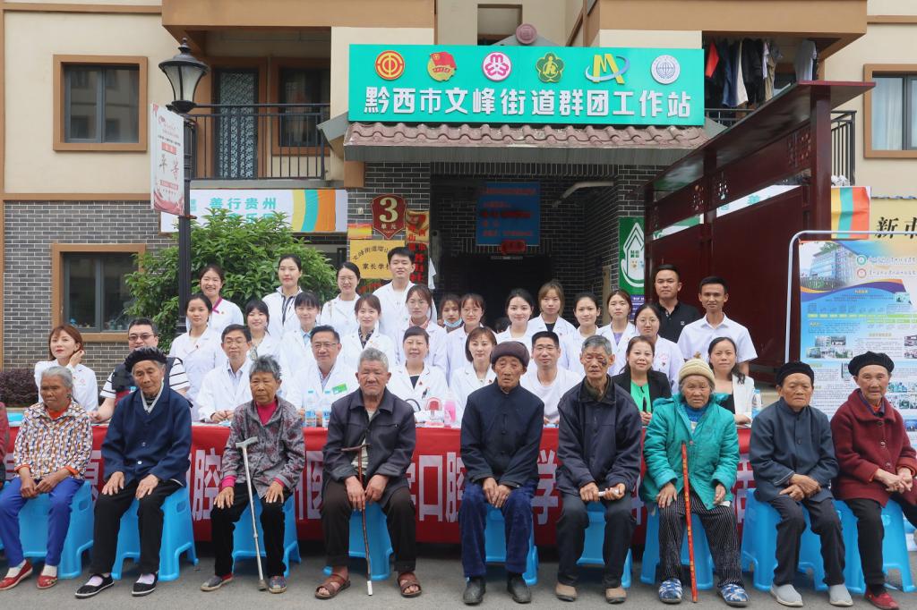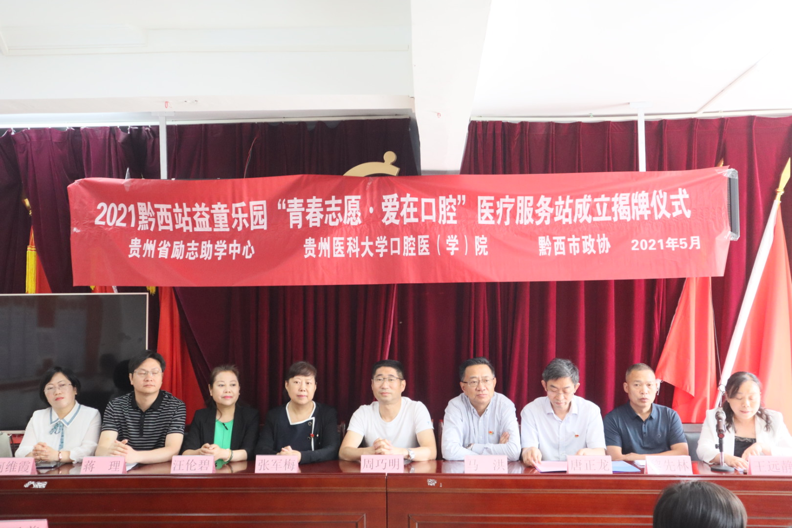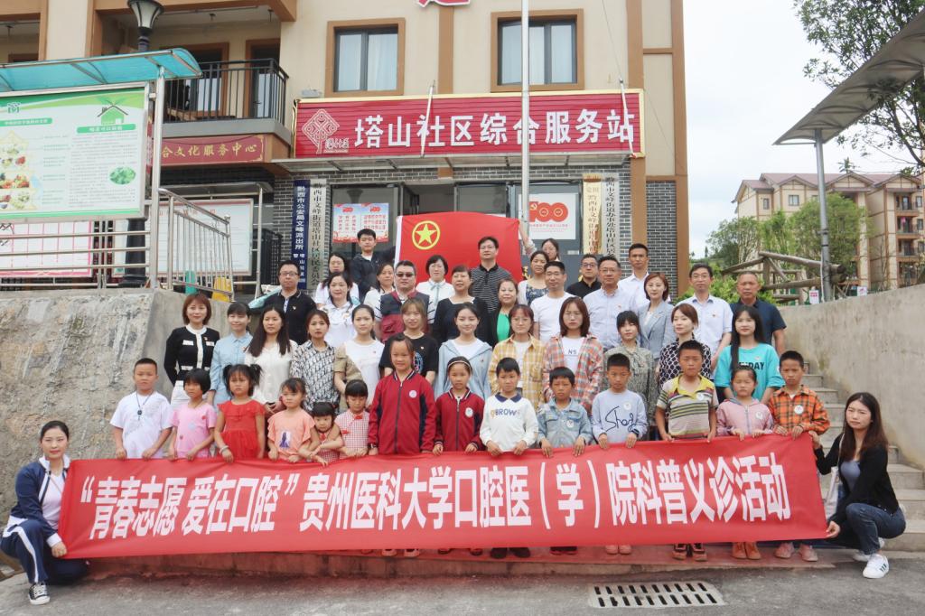 5月16日,由beat365唯一官方网站口腔医学院、附属口腔医院(后文简称口腔医(学)院)与贵州省励志助学中心共建的首个【青春志愿·爱在口腔医疗服务站】落地毕节市黔西站益童乐园并举行揭牌仪式。口腔医(学)院党委书记张军梅、院长马洪、副院长唐正龙、党委副书记何雨羲;贵州省励志助学中心秘书长、民盟省直关爱教育支部主委周巧明、秘书长助理、团委书记杨治毅;黔西市政协副主席汪伦碧、黔西市智力支边办主任王远静、黔西市文峰街道党工委书记蒋理、黔西市卫健局副局长何维霞、黔西市民政局副局长黎先林、黔西市文峰街道办事处人大工委主任卢春;上海交通大学医学院附属第九人民医院口腔颅颌面科副主任医师乌丹旦出席揭牌仪式。口腔医(学)院口腔颌面外科医生吴睿、预防及儿童口腔科医生魏宏琳、口腔修复种植科医生刘春影、团委工作人员及塔山社区部分老人和儿童代表60余人参加。