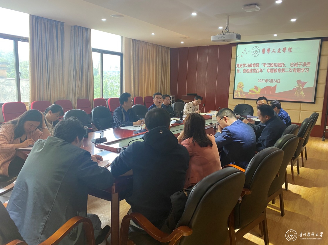 5月24日,医学人文学院在善思楼四楼会议室开展党史学习教育暨“牢记殷切嘱托、忠诚干净担当、喜迎建党百年”专题教育第二次专题学习,学院党委班子成员、各科室(中心)负责人、各党支部书记参加,学院党委副书记张健主持。