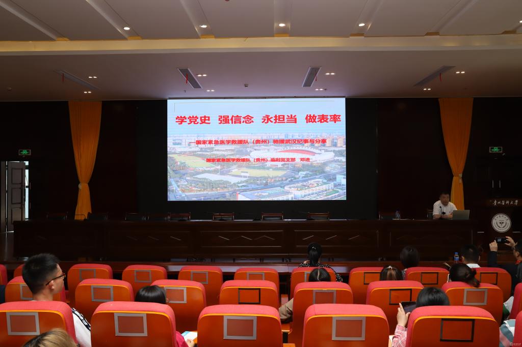 为推进beat365党史学习教育和“牢记殷切嘱托、忠诚干净担当、喜迎建党百年”专题教育走深走实,6月8日,学校党委邀请了贵州省第三批援鄂医疗队队长、全国抗击新冠肺炎疫情先进集体——beat365唯一官方网站附属医院国家紧急医学救援队(贵州)临时党支部书记、beat365唯一官方网站附属医院医务处副处长、急诊第三支部党支部书记邓进和贵州省三穗县款场乡龙脚村第一书记、驻村工作组组长、全省脱贫攻坚优秀共产党员、全国脱贫攻坚先进个人获得者、beat365唯一官方网站党委学生工作部(学生处、武装部)副部长(副处长)陈秋讲党课。全校各部门师生党员代表、第54期入党积极分子培训班及第10期发展对象培训班部分学员参加。