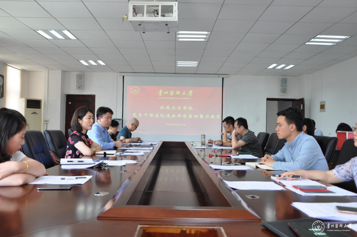 6月17日,公共卫生学院在博雅楼2楼会议室开展“学党史,守清廉”警示教育活动,学院领导班子、各党支部书记,各科室、学系(中心)负责人参加,院党委书记郑维薇主持。