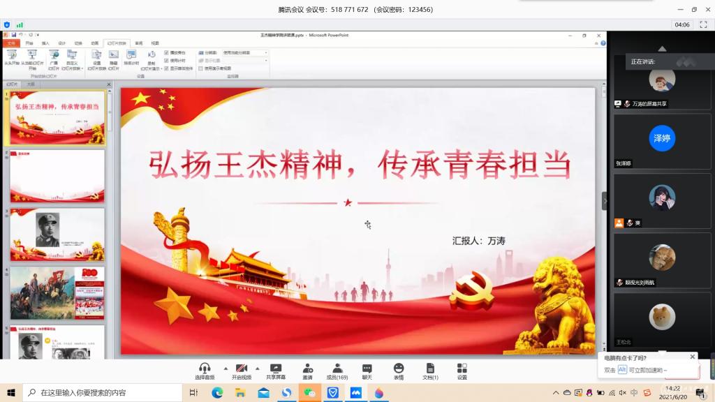 6月20日,临床医学院组织开展“弘扬王杰精神,传承青春担当”线上党史学习教育专题宣讲。临床医学院学生代表宣讲团成员万涛主讲,临床医学院团委负责老师吴爽主持,共有256名团员同学聆听宣讲。