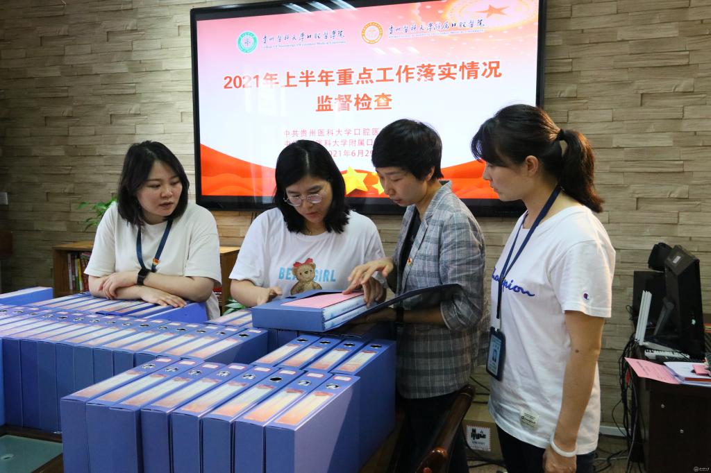 会后,检查组现场查阅了口腔医(学)院2021年上半年重点工作落实情况相关材料。