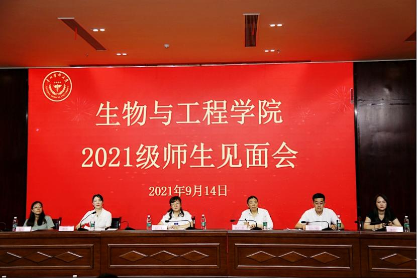 9月14日,生物与工程学院在南校区道德讲堂召开2021级新生师生见面会,学院党委书记封韬、院长刘红美、党委副书记李宗梅、副院长胡祖权、学院党委委员、全体教研室主任、全体班主任、辅导员及2021级新生参加。会议由李宗梅主持。