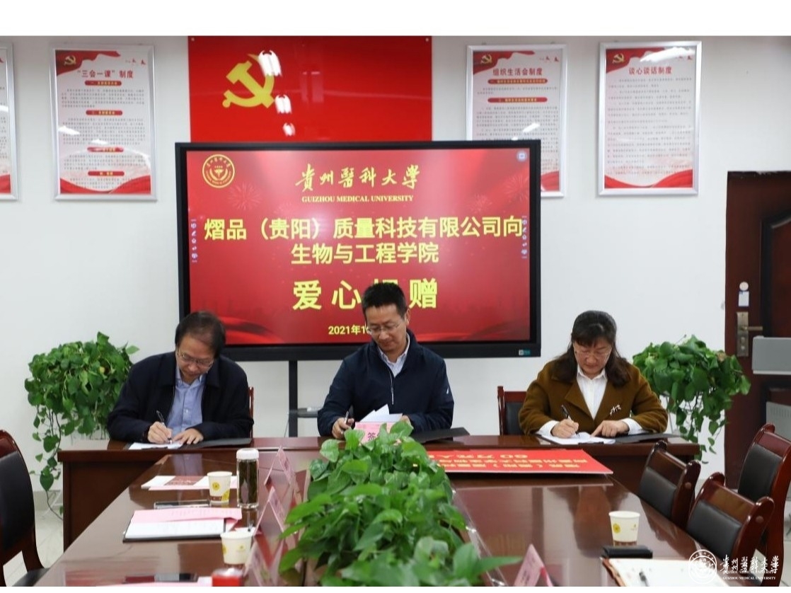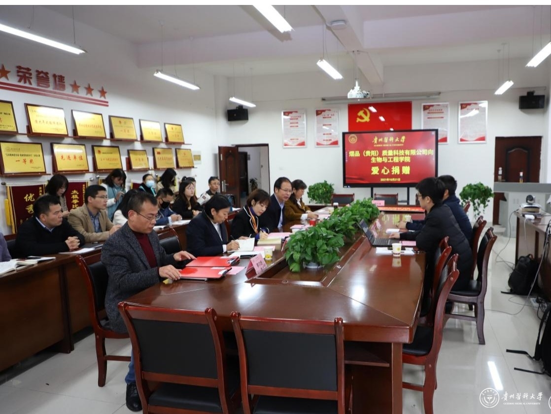 10月21日,熠品(贵阳)质量科技有限公司与生物与工程学院爱心捐赠签约仪式在厚德楼五楼会议室举行。beat365唯一官方网站教育发展基金会理事长郭兵、基金会秘书长彭云、生物与工程学院党政班子全体成员、各教学单位负责人、学术班主任、辅导员参加捐赠仪式。会议由生物与工程学院院长刘红美主持。