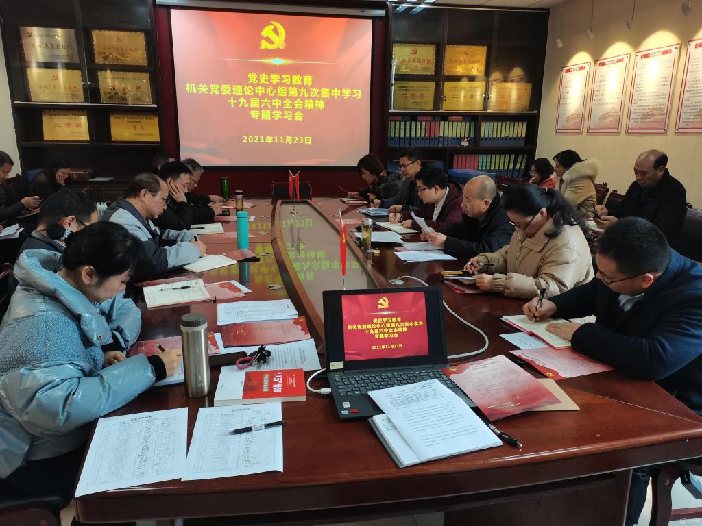 11月23日,机关党委在知雨楼8楼会议室召开党史学习教育机关党委理论中心组第九次集中学习暨党的十九届六中全会精神专题学习会。机关党委委员、机关各支部书记、机关全体工作人员参加,机关党委书记邓舟主持。