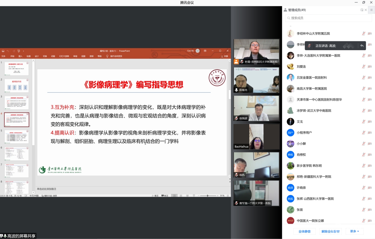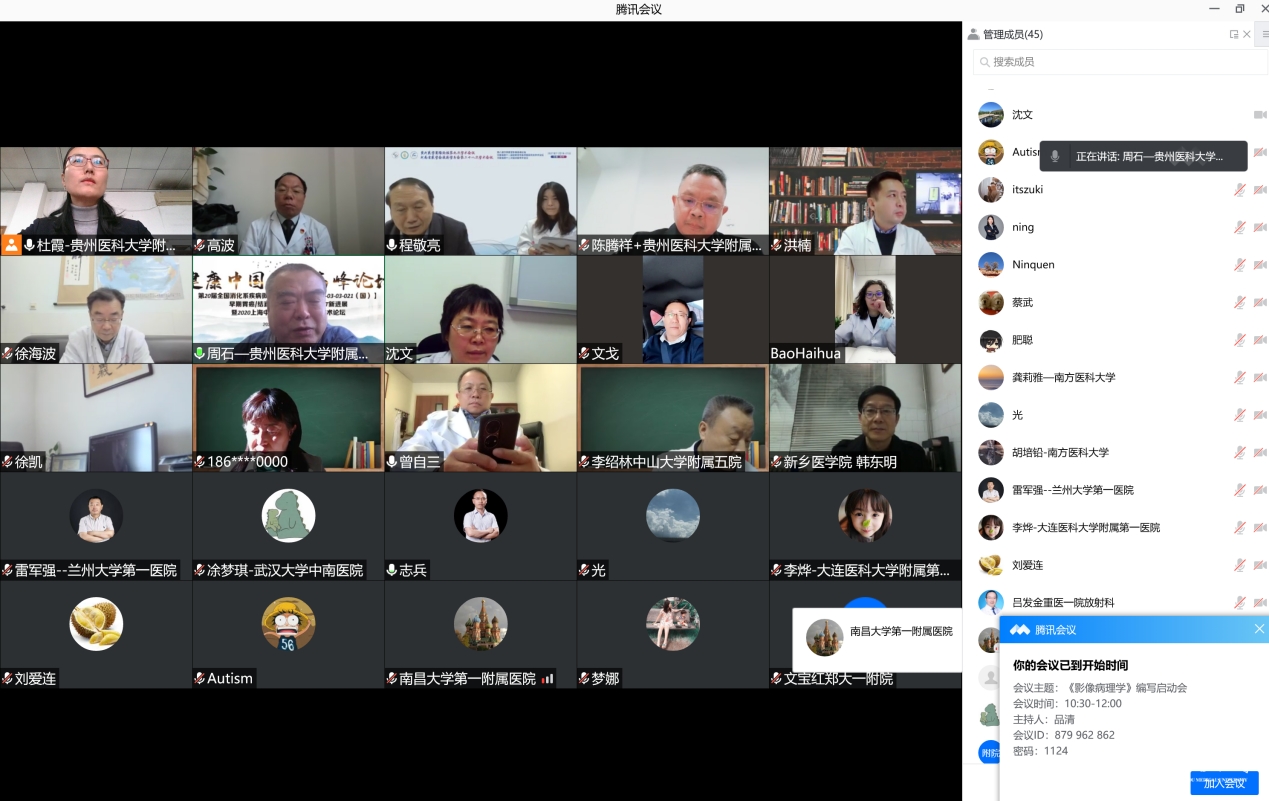 11月24日,由医学影像学院领衔组织的《影像病理学》教材(人民卫生出版社出版)编写启动会议顺利召开。疫情期间,此次会议是通过腾讯会议形式举办的网络会议。出席本次会议的有北京大学人民医院院长助理洪楠、苏州大学附属第一医院影像科主任胡春洪、大连医科大学医学影像学院副院长刘爱莲、遵义医科大学附属医院副院长张体江、beat365教务处处长温小军、附属医院科研处处长陈腾祥、教材科科长肖榜权,医学影像学院院长周石、附属医院影像科主任高波、附属医院病理科主任杨文秀等来自全国37家知名医学院校及三甲医院的教授、专家参加。会议由医学影像学院副主任医师杜霞主持。