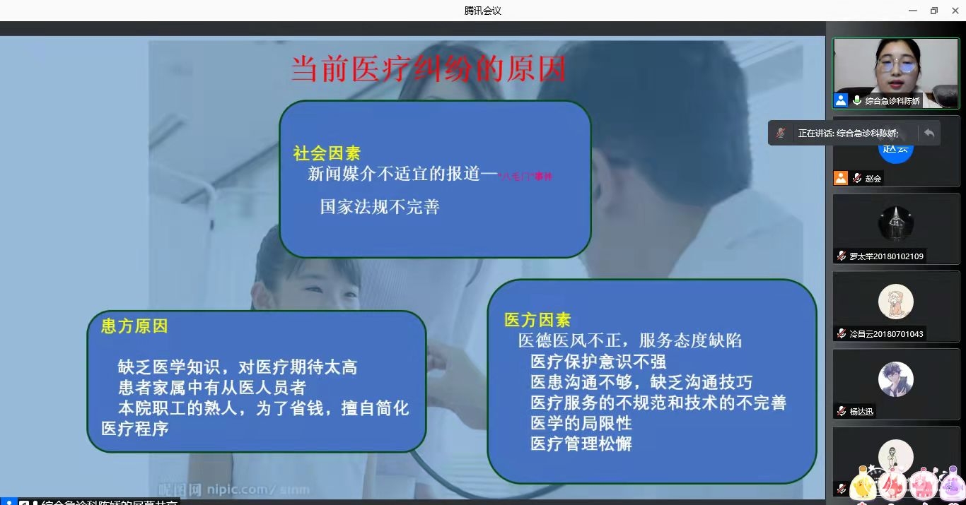 11月26日,附属口腔医院综合急诊科陈娇为2017级、2018级以及2019级学生开展了以“口腔医患沟通技巧”为主题的讲座,讲座采取腾讯会议的方式进行,由口腔医学院2018级辅导员赵会主持。