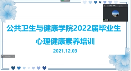 为帮助毕业生积极树立正确的就业观念,全面提高学生心理素质,促进学生健康成长,从容应对就业压力,完成就业心理调整。12月3日,公共卫生与健康学院特别邀请贵州省委党校文史教研部副主任薛婧,开展‘就业从“心’开始”心理健康素养云讲座。院长洪峰、副书记何江、学生科科长周洪媛、全体辅导员、班主任、2022届毕业生及各班级心理委员参加。