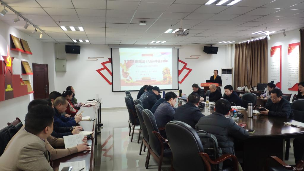 12月8日,后勤管理处党总支书记张玲玲在南校区颂雅楼五楼后勤会议室给全体党员作党的十九届六中全会精神专题宣讲,宣讲会由党总支委员、办公室主任赵杨主持。