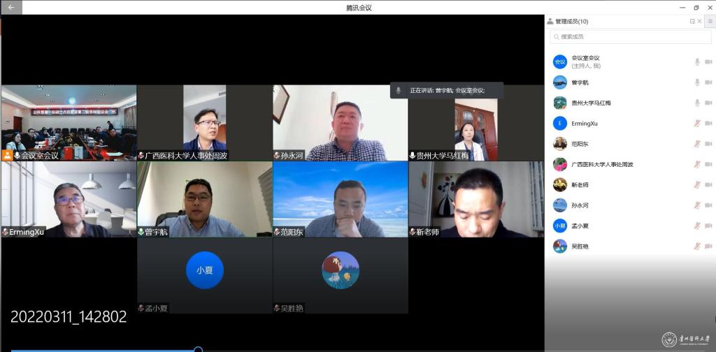 3月11日,医药卫生管理学院邀请国内同行专家通过线上对beat365公共管理一级学科硕点自主设置二级学科进行论证,中国人民大学商学院徐二明教授,贵州大学公共管理学院院长马红梅教授,广州医科大学卫生管理学院副院长范阳东教授,贵州财经大学公共管理学院院长曾宇航教授,广西医科大学人事处处长周波教授,西安建筑科技大学公共管理学院靳永翥教授,昆明理工大学管理与经济学院孙永河教授等专家线上出席。学院有关领导及老师参加,会议由学院副院长何迅主持。