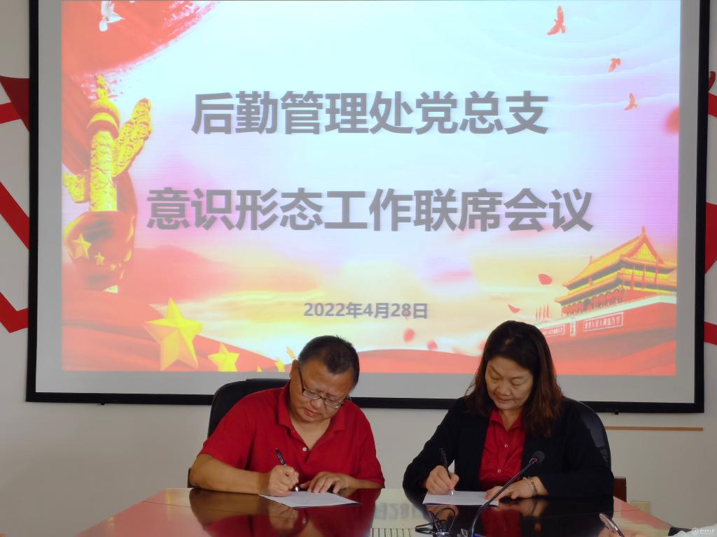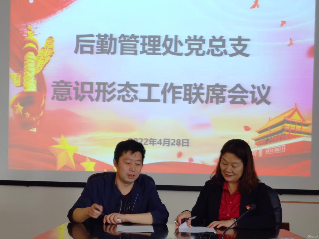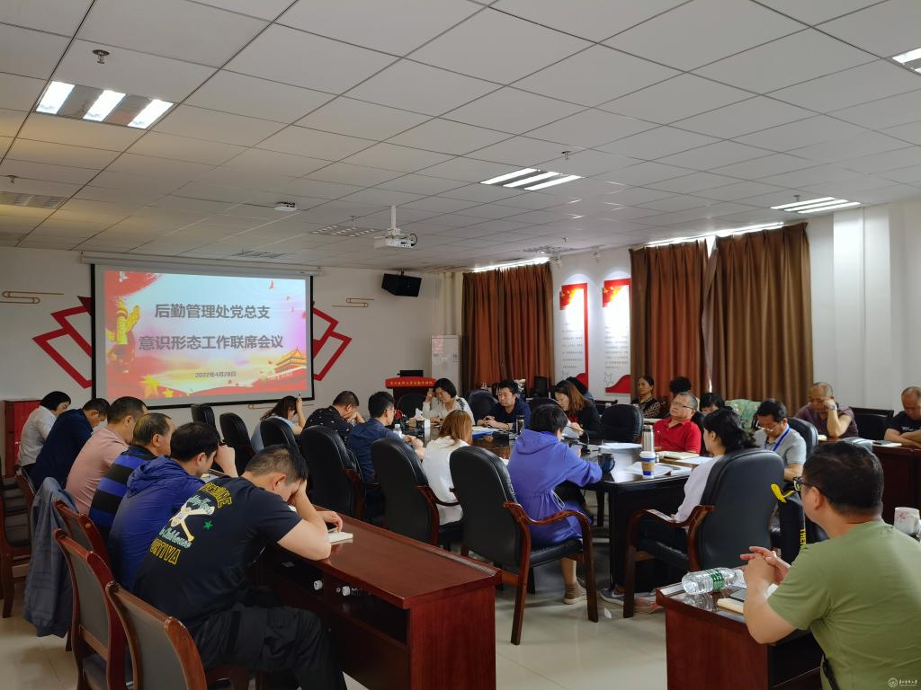 4月28日,后勤管理处党总支在南校区颂雅楼五楼后勤会议室召开2022年上半年意识形态工作联席会议。会议由党总支书记张玲玲主持,党总支全体党员及副科级以上干部参加。