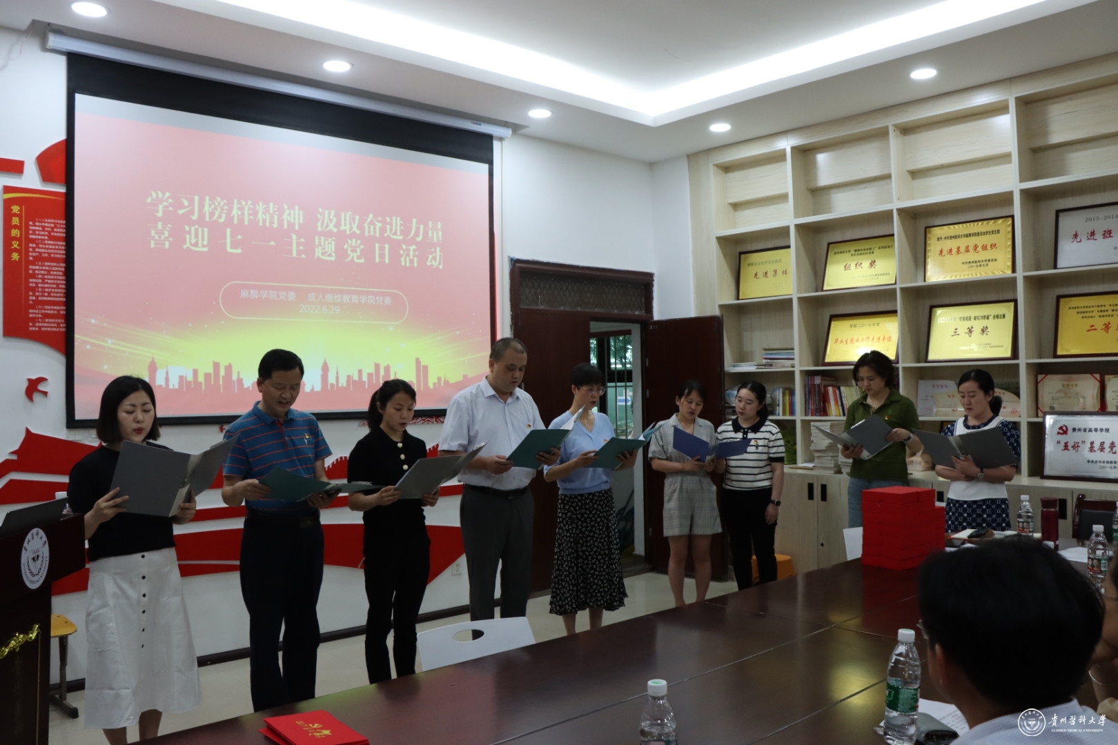 活动由学生党员分享了英雄模范人物陈毅、肖劲光、黄克诚、杨善洲的生平事迹;麻醉学院教师党员朗诵了诗歌《颂歌献给党》;成人继续教育学院全体党员合唱《没有共产党就没有新中国》,共同祝福祖国繁荣昌盛,百年大党生日快乐!