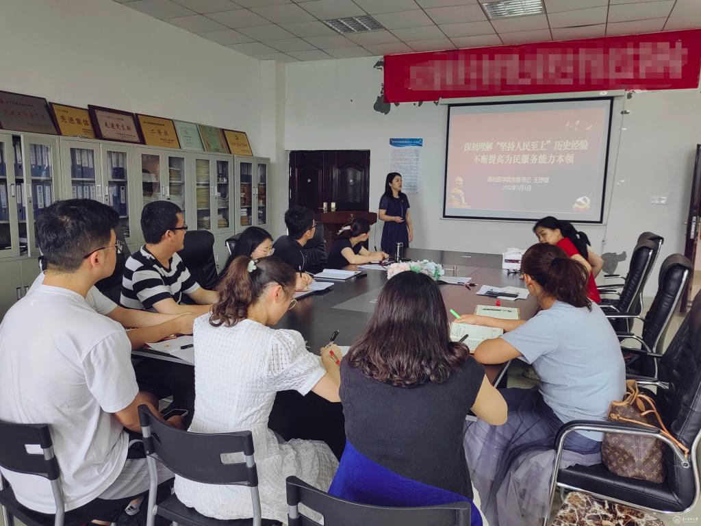 7月1日,基础医学院党委书记王妤煜以《深刻理解“坚持人民至上”历史经验 不断提高为民服务能力本领》为题,为微生物党支部全体党员讲专题党课,学院综合办主任陈圆圆,党支部书记陈峥宏及全体党员参加。