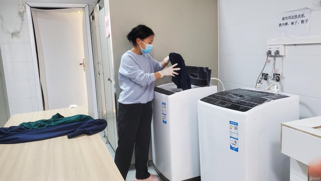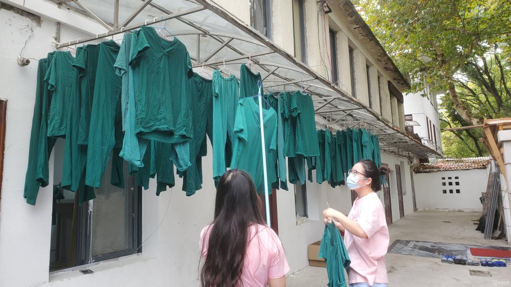 每天早上,小组成员要对前一天消杀衣服进行清点、整理,并由宿舍管理员对相应区域进行消杀;下午,小组成员要对当天衣物进行消毒、清洗、晾晒,确保疫情防控工作人员衣物的正常供应。正是他们的默默奉献,与院里其他后勤保障人员打好配合、坚守后方,才能使一线工作人员放心、安心。