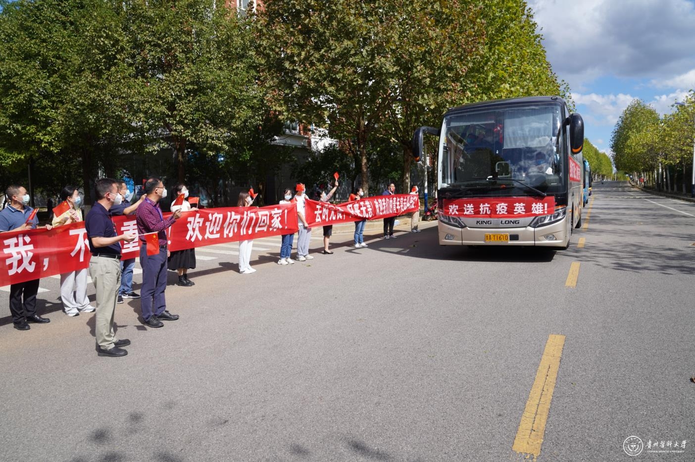 10月5日,基础医学院支援观山湖区气膜方舱实验室的100名师生,在经过18天奋战后,圆满完成任务,胜利凯旋。校党委副书记汤磊、副校长沈祥春、相关部门负责人以及基础医学院党政领导、全体辅导员,在南校区学生宿舍六栋路口欢迎青年突击队回家。