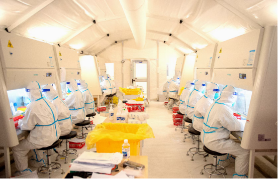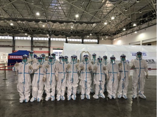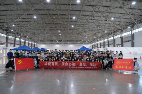 9月17日中午,基础医学院接到通知,闻令而动,迅速组建7名教师、93名学生志愿者,并于当天下午从花溪大学城出发支援观山湖区气膜方舱实验室。志愿者到达观山湖会展中心方舱实验室驻地后,快速组建小分队,进行院感专家集中院感学习、防护服穿脱等培训,持续到凌晨3时。100位队员,分为两个小队,分别由肖朝伦、王琪老师带队进驻“御兔号”,石明隽、韩冰老师带队进驻“火眼号”方舱实验室;另崔古贞、田益明两位老师全程参与整个会展方舱实验室院感,刘旭老师协助会展方舱领导小组日常事务工作,肖朝伦老师负责全体志愿者的日常事务及与方舱领导指挥部领导的协调对接。从那一刻起,青年突击队的抗疫行动开始了,每天依据分工各自忙碌而充实。