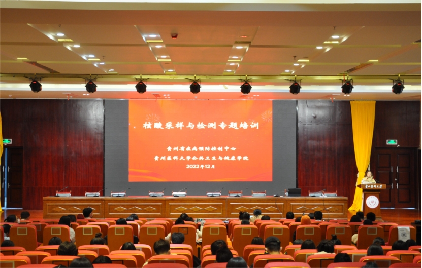 12月4日,公共卫生与健康学院邀请贵州省疾病预防控制中心(CDC)实验中心副主任廖春、病毒科蒋维佳、万永虎、付琳老师为卫生检验与检疫专业本科生和部分研究生开展有关新冠区域核酸采样与检测流程、个人防护、生物安全等相关知识的培训,学院学生管理科副科长原琦、辅导员、班主任参加培训。