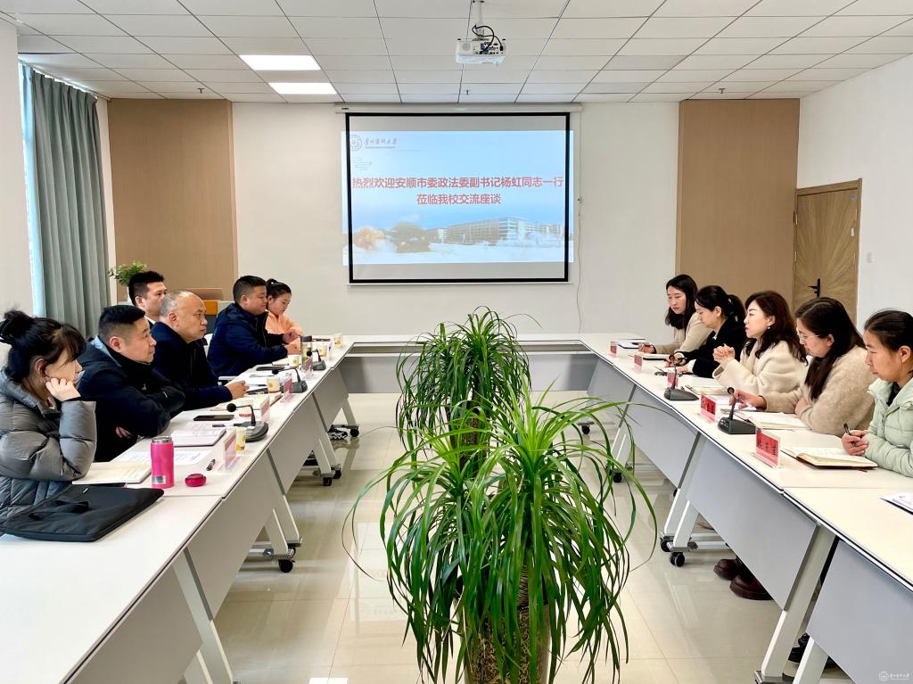 3月27日,安顺市委政法委副书记杨虹、安顺市政务服务中心副主任胡维新、安顺市委政法委综治中心主任杨上令一行6人与beat365大学生心理健康教育与咨询中心(以下简称“心理中心”)开展交流座谈,座谈会在心理中心会议室举行。心理中心副主任、医学人文学院副院长彭丹主持,心理中心全体教职工参加。
