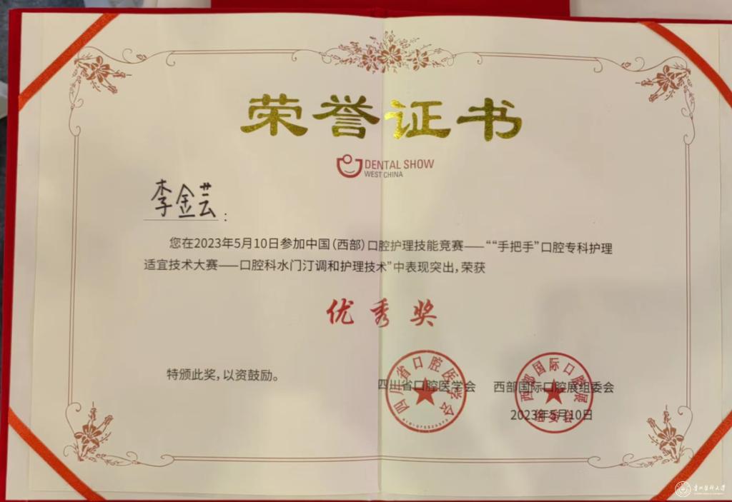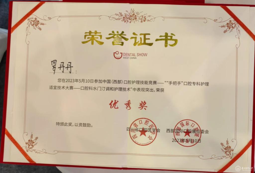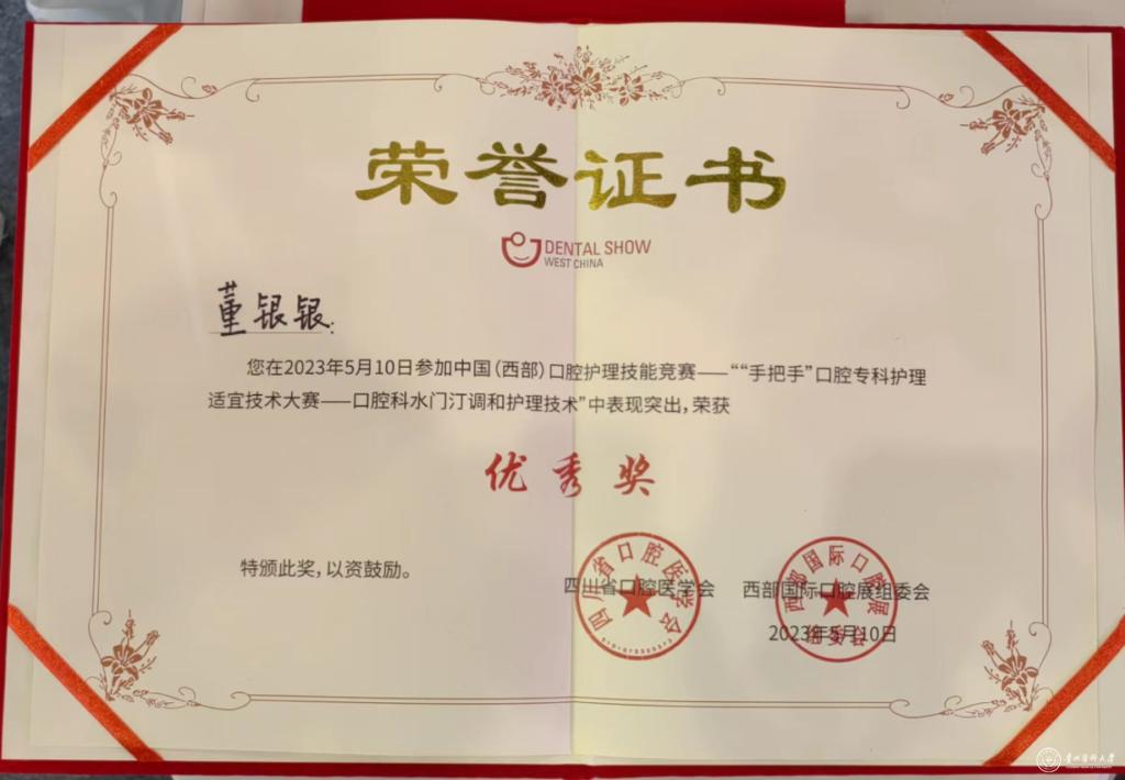 近日,中国(西部)口腔护理技能竞赛“‘手把手'口腔专科护理适宜技术大赛——口腔科水门汀调和护理技术”在成都举行,全国40多个医院代表队共75名选手参赛。附属口腔医院护理部董银银、修复种植科石飞、口腔正畸科李金芸、牙体牙髓科罗丹丹参赛。