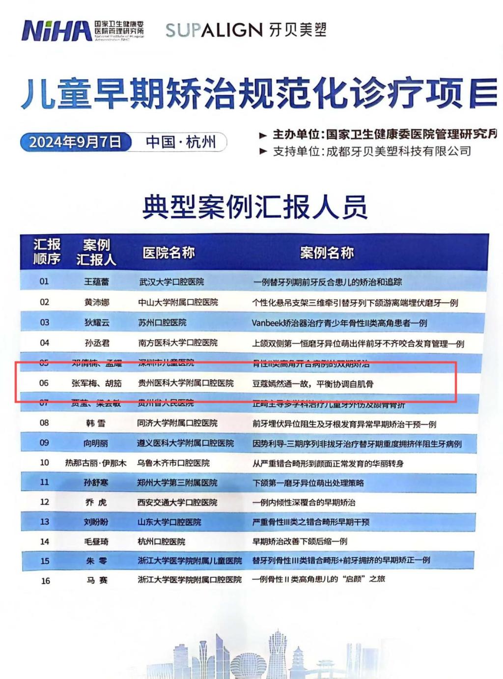 9月7日,口腔医学院、附属口腔医院党委书记张军梅,正畸科医生胡笳的“豆惹嫣然通一故,平衡协调自肌骨”病例在全国410例病例申报遴选中最终脱颖而出名列第六,并在典型案例交流会上进行汇报。