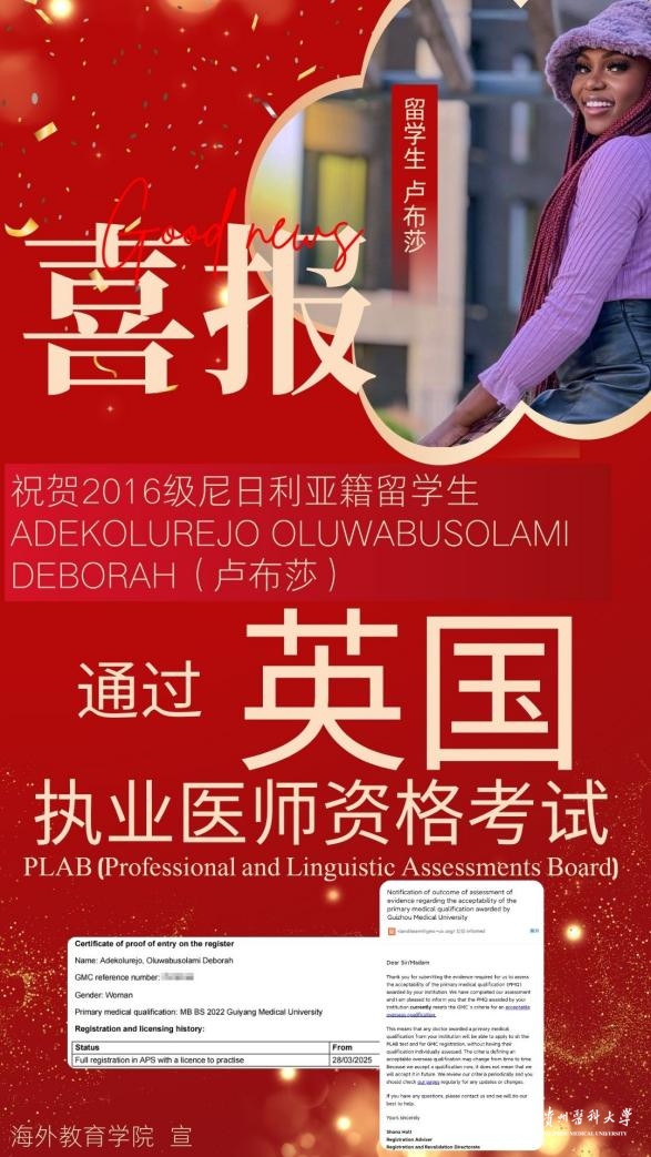 近日,尼日利亚籍留学生卢布莎(ADEKOLUREJO OLUWABUSOLAMI DEBORAH)通过了英国通用医学理事会(GMC)组织的执业医师资格考试PLAB(Professional and Linguistic AssessmentsBoard),成为首位获得英国医师执照的beat365留学生毕业生。此次突破标志着beat365医学人才培养与国际高水平执业标准实现接轨。
