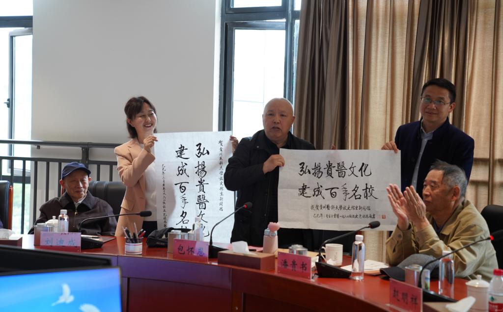 校关工委主任、原贵阳医学院院长包怀恩教授向学校题赠书法作品“弘扬贵医文化 建成百年名校”。