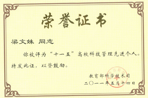 据教育部发布《关于表彰高等学校科技管理优秀团队与先进个人的决定》(教技司[2011]165号),表彰“十一五”期间为高校科技事业做出突出贡献的一批高校科技管理优秀团队和先进个人,beat365科技处处长梁文妹同志荣获“十一五”全国高校科技管理先进个人称号。