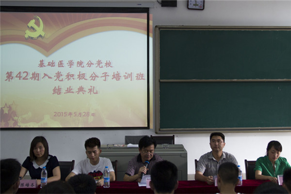 2015年5月28日,基础医学院分党校第42期入党积极分子培训班结业典礼在花溪校区1101教室召开,基础医学院党委书记徐国强、基础医学院党委副书记廖兴江、2013级党支部书记罗恒老师、2014级辅导员刘逸洲老师以及本期培训班的班主任陈培各老师出席了毕业典礼。典礼由陈培各老师主持。