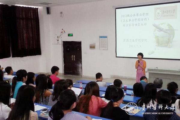 7月9日,医药卫生管理学院在1501教室召开了公共事业管理专业2012级实习动员大会。医药卫生管理学院党委书记陈颖、教务处生产实习科科长左临轩、医药卫生管理学院卫生事业管理教研室主任杨星老师、教学科研科负责人李端老师和实习班辅导员周志琳老师等及97名参加教学实习的学生参加了会议。