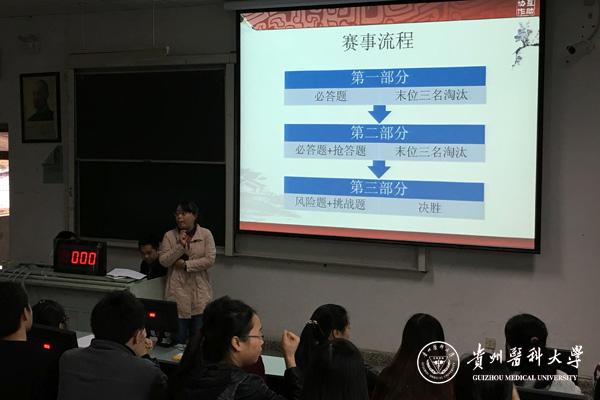 本次大赛共有来自两个年级的19支团队共计76名选手参赛。经过11月17日的笔试初赛,筛选出11支团队44名选手进入最后的决赛。本次比赛由必答题、抢答题、风险题及挑战题等多个环节组成。必答环节同学们沉着应答,抢答环节大家你争我抢……比赛的高潮出现在挑战题,由各队的组长选择题目挑一组对手回答,答对本组加相应分值,对手减相应分值,答错亦然。最终,来自12级医学影像学的江梦露、傅小珊、莫筱雅和李颖凭借出色的发挥,拔得头筹。