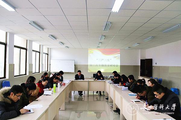 根据学校党通〔2015〕46号文件精神,12月9日上午10点,医药卫生管理学院在、善思楼(南楼)5楼会议室召开“三严三实”第三次专题教育研讨会,会议由学院党委书记陈颖同志主持,全院教职工参会。