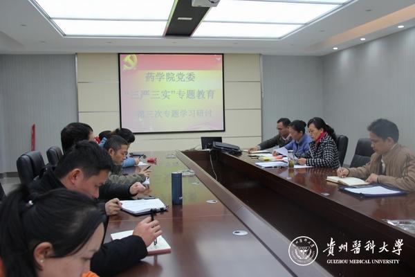 根据校党委关于开展“三严三实”专题教育的总体安排,12月9日,药学院党委在格物楼六楼会议室召开“三严三实”专题教育第三次专题学习研讨。会议由药学院党委书记席晓岚主持,党委副书记徐贵荣,药学院常务副院长沈祥春,药物制剂重点实验室副主任李勇军,党委委员和各党支部书记参加学习。