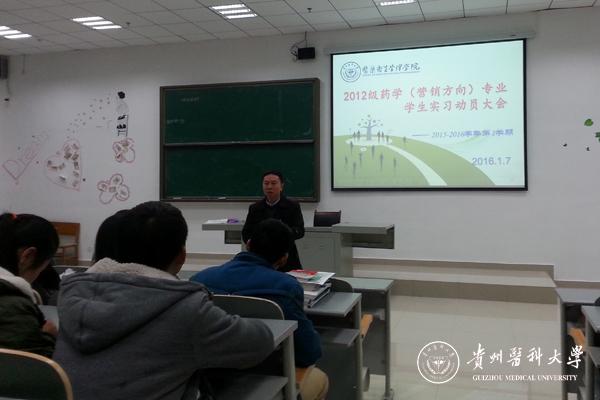 1月7日中午,医药卫生管理学院在4603教室召开了2012级药学(营销)专业实习动员大会,学院党委书记陈颖、院长汤磊、教研科副科长李端和部分专业教师出席了动员大会。