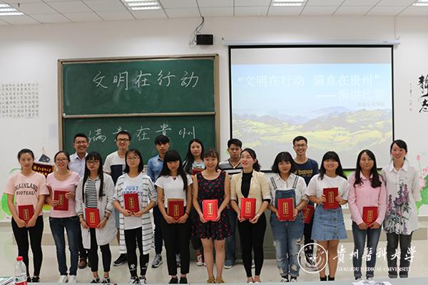 为认真贯彻省委关于深入开展“文明在行动·满意在贵州”系列活动,大力提升我省旅游服务水平和管理质量等重要指示的要求,6月16日下午,食品安全学院在明理楼7203教室举行了“文明在行动·满意在贵州”主题演讲比赛。陈卫娅老师、原琦老师及全体学生参与了此次活动。