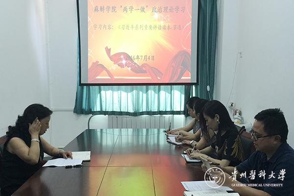 7月4日下午,麻醉学院在院会议室开展“两学一做”政治理论学习。党委书记刘建华主持,党委委员高鸿、全体职工党员参加。