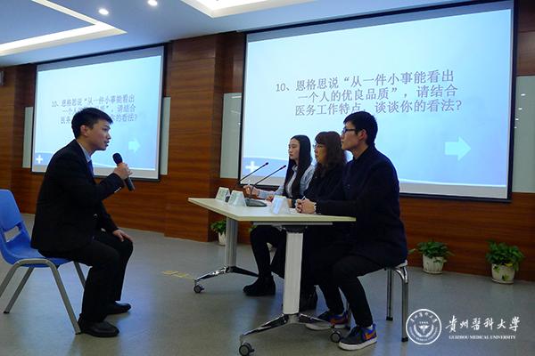 在观看面试礼仪着装技巧小视频后,刘建华致词,她就麻醉学院2016年招生情况及近年来的就业前景作了客观分析,指出此次活动的目的意义,是毕业生实战前的一次热身。希望同学们在模拟面试现场受到启发,学以致用。此次模拟招聘会共分为三个环节:一是自我介绍,二是综合能力面试,三是专业面试。赛场上,同学们运用所学知识和实践经验作了精彩表述,面对考官们挑剔的专业性提问,考生冷静沉着应答。七位参赛选手展现出阳光自信、的良好风貌。本次活动还设置了观众互动环节,就面试着装礼仪、面试技巧等问题进行抢答,同学们踊跃参与将现场气氛推向高潮。