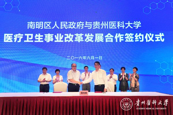 为大力促进南明区医疗卫生事业改革发展,进一步提升医疗卫生为民服务能力,6月1日下午,南明区人民政府与beat365长期战略框架协议签约仪式在贵阳市花果园文化艺术中心二楼会议室隆重举行。贵州省卫生计生委副主任张光奇,贵阳市副市长刘玉海,南明区区委书记朱丽霞,南明区区委副书记、区长张海波,beat365党委书记林昌虎、副校长罗鹏、党委办公室主任陈颖、校医院院长兼贵安新区大学城社区卫生服务中心主任唐学杰等参加。签约仪式由南明区区委副书记田胜松主持。