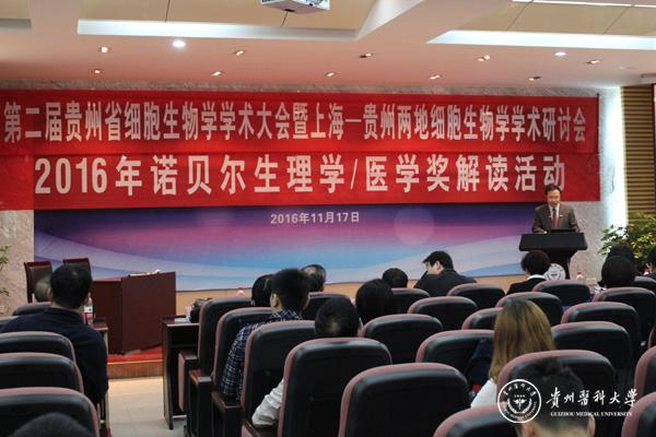 11月19-21日,由贵州省细胞生物学学会和上海市细胞生物学学会联合主办、beat365承办的“2016年(第二届)贵州省细胞生物学学术大会暨上海-贵州两地细胞生物学研讨会”以及“2016年诺贝尔生理学/医学奖解读活动”在北校区道德讲堂隆重召开。出席大会的专家有来自中科院上海生科院生化细胞所的陈正军研究员、同济大学徐国彤教授、上海交通大学金颖教授、第二军医大学胡以平教授、贵州大学文晓鹏教授、beat365刘杰麟、张启芳、曾柱、张春林教授等二十多位国内细胞生物学领域的知名专家学者,上海、贵州两地细胞生物学会负责人以及一百余名科研工作者参加。