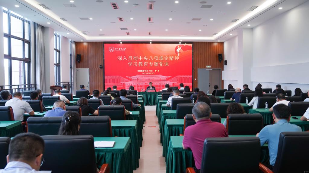 6月23日,校党委副书记、校长罗鹏以“深入学习贯彻中央八项规定及其实施细则精神 以作风建设新成效推动学校高质量发展”为题讲授专题党课。党办与机关党委党支部及校办与发规党支部全体党员、图书馆与档案馆党支部及校医院党支部委员,以及罗鹏分管联系部门的相关同志、关键岗位干部、新提拔干部、年轻干部代表等参加党课学习。党课由党政办公室主任、党委办公室(保密办公室)主任、党办与机关党委党支部书记杨毅主持。
