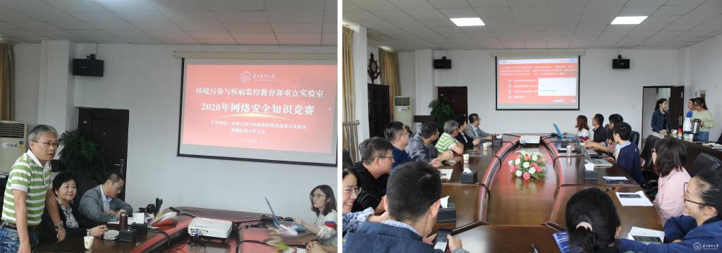9月21日,由环境污染与疾病监控教育部重点实验室(以下简称“环控教育部重点实验室”)与校工会联合举办的“2020年网络安全知识竞赛”在博雅楼六楼会议室举行。校工会主席钟良、副主席陈伟出席竞赛现场。环控教育部重点实验室、贵州省卫生发展研究院、化学品毒性检测中心师生40余人参加了竞赛活动。