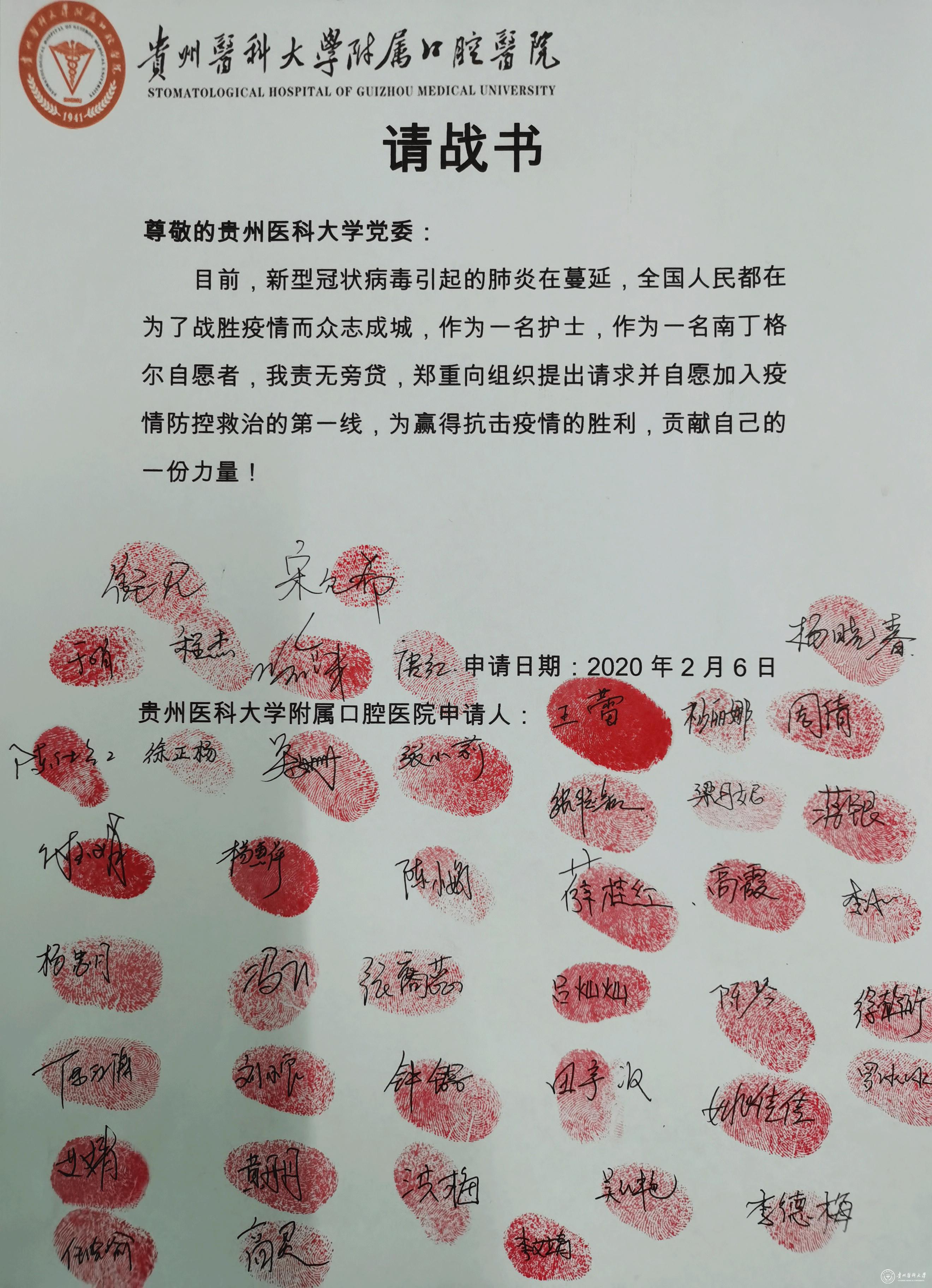 请战书上,一个个签名、一个个手印,是不忘初心的大爱,是牢记使命的职责所在,是一个个普通护士“以命相托”抗击新型冠状病毒疫情的决心,更是南丁格尔誓言的传承,她们在国家艰难时刻无所畏惧,不忘医者初心,携手共克时艰。护理团队的伙伴们纷纷表示,“我们不计生死、不计报酬,随时听候调令,必将义无反顾,奔赴一线,做出我们应有的贡献”。