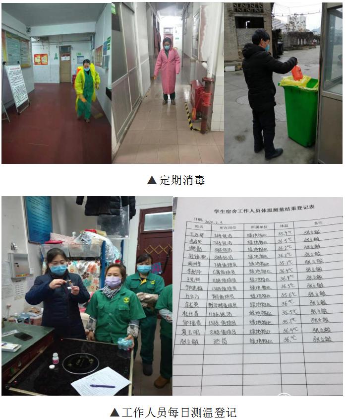 组织物业公司对南、北校区公共区域进行消毒;加强对进出人员的管理,外来人员进入校园时必须佩戴口罩,测量体温无异常后方可进入;每天工作前对物业公司员工进行岗前体温检测登记及记录工作。