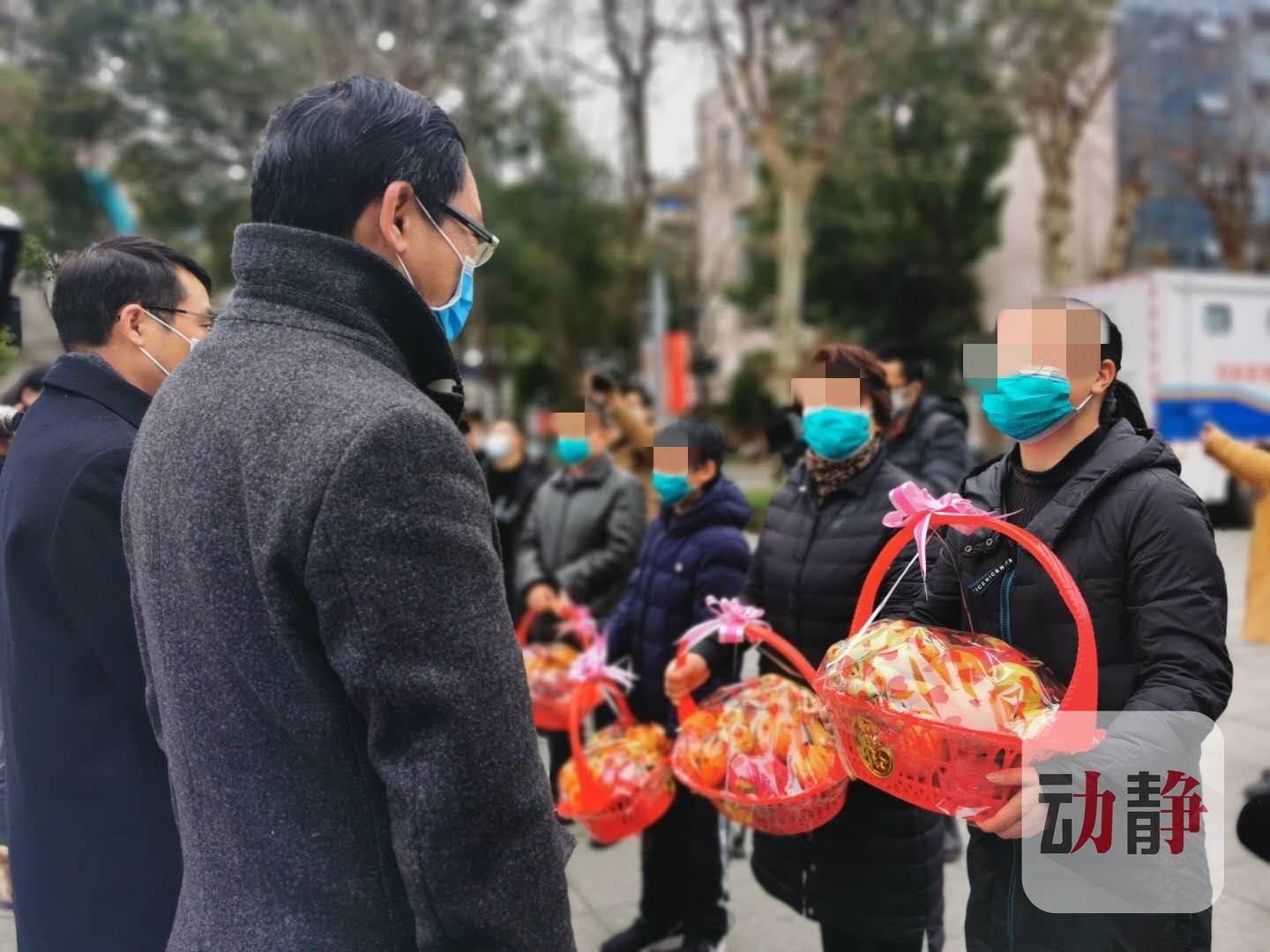 今天上午,在贵医附院第一住院楼前,医护人员将准备好的果篮送给4名新冠肺炎治愈患者,祝贺他们战胜病毒,治愈出院。