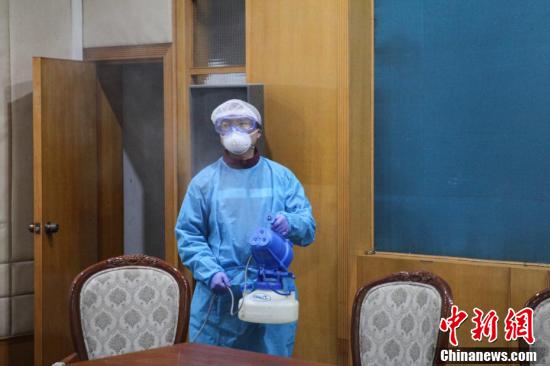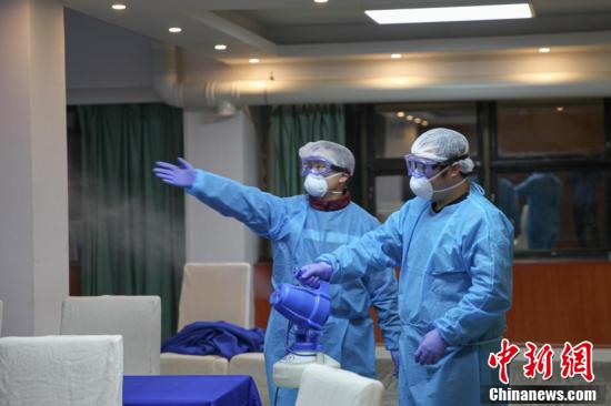 2月18日,贵州省支援湖北鄂州医疗队防疫工作组工作人员对医疗队部分队员入住酒店的公共性场所(会议室、办公区域)进行预防性消毒。
