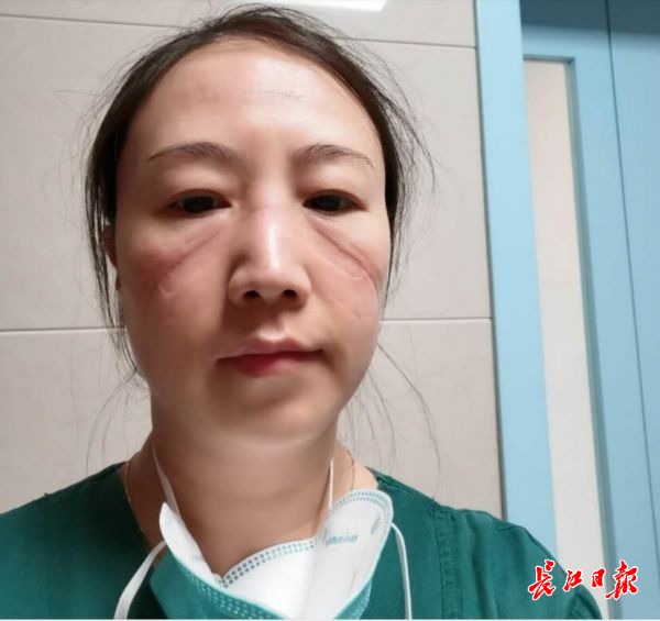 在吴建丽的个人美篇中,她发布了一张脸上满是压痕的自拍照,并配文:“每当下班后看着褪下口罩的自己,其实心里面也是挺心酸的。但想想我们的病人,我们的国家正在承受如此巨大的痛苦,我受的这点苦又算得上什么。”