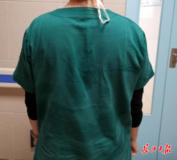 吴建丽每天要在隔离病区内连续工作5个小时。“穿着厚重的防护服连续工作确实有点难受,有时感觉呼吸都有点困难。”吴建丽从微信上给长江日报-长江网记者发来一张背影照,照片中她身上穿的深绿色护士服已经被汗水浸湿。她说,防护服不太透气,每天脱下后,里面的衣服都湿透了。