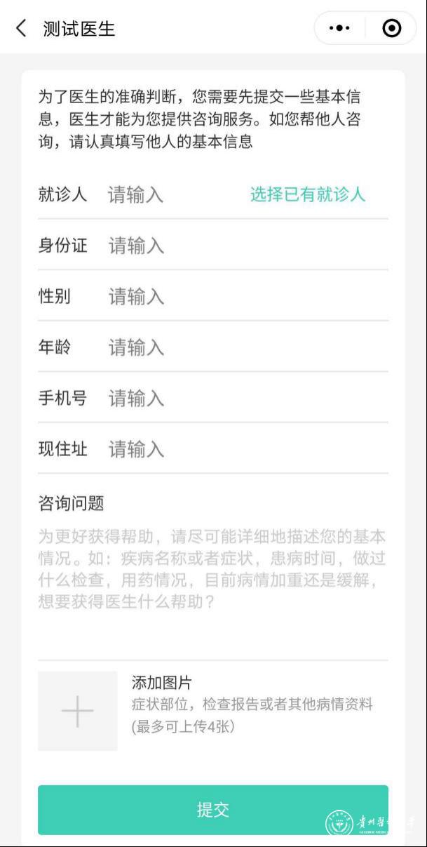 填入就诊人信息,若已有就诊人可点“选择已有就诊人”,并填写咨询问题内容(支持上传图片),点击【提交】